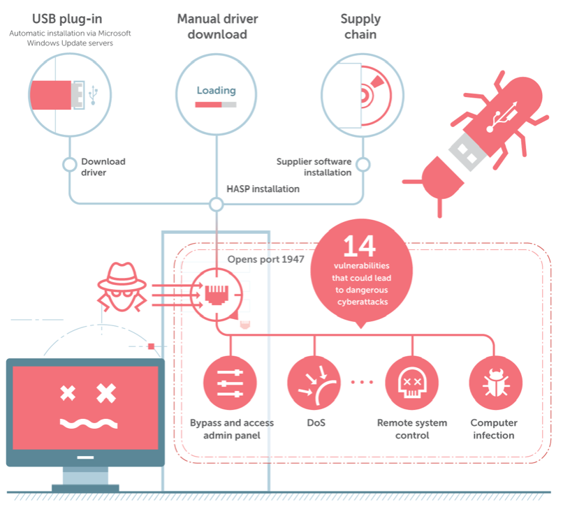 Let’s take a look at our research. The product in question was a hardware and software combo: A USB token and some drivers and software that was installed on computers to work with license keys. The USB token needed to be connected to a PC or server on which the relevant license was required.