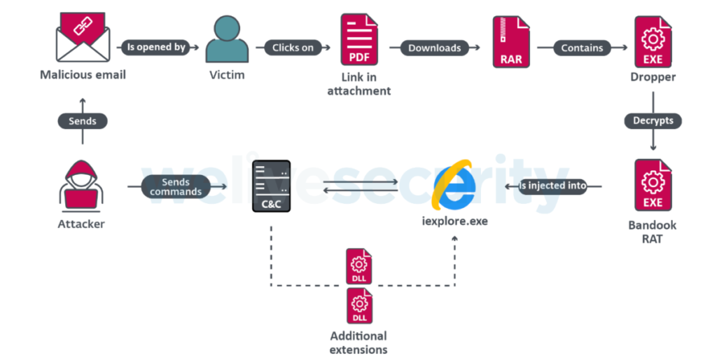 Updated versions of the Bandook RAT are being used in a campaign targeting corporate networks in Spanish speaking countries, mainly Venezuela. The main targets of the campaign, which has been dubbed “Bandidos”, are corporate networks in Venezuela – some in manufacturing, others in construction, healthcare, software services and retail. The infection chain features spear phishing emails with a PDF file containing a URL that leads to an encrypted RAR file which in turn installs Bandook malware. Bandook is an old remote access Trojan: there are references to it being available online as early as 2005, though its use by organized groups was not documented until 2016.