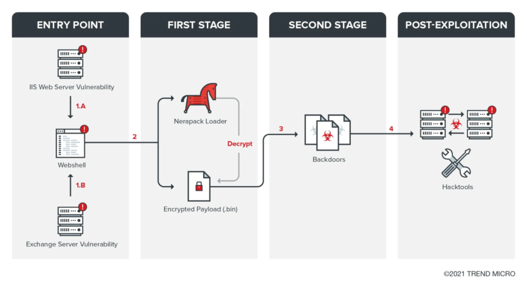 Trend Micro has determined that the TropicTrooper/Earth Centaur APT actor targeted organizations in the transportation industry and transport-related government agencies in July 2020. It was observed that the group tried to access some internal documents (such as flight schedules and documents for financial plans) and personal information on the compromised hosts (such as search histories). The threat group used Internet Information Services (IIS) server and Exchange server vulnerabilities as entry points to further deploy webshells, .NET loader and first stage backdoors. Depending on the target, it uses backdoors with different protocols, and it can also use the reverse proxy to bypass the monitoring of network security systems. The group uses open-source frameworks to make customized backdoors. This enables it to create new backdoor variants more efficiently. After successfully exploiting a vulnerable system, the threat actor will use multiple hacking tools to discover and compromise machines on the victim’s intranet and tools for exfiltration. It exploits vulnerable websites and uses them as C2 servers.