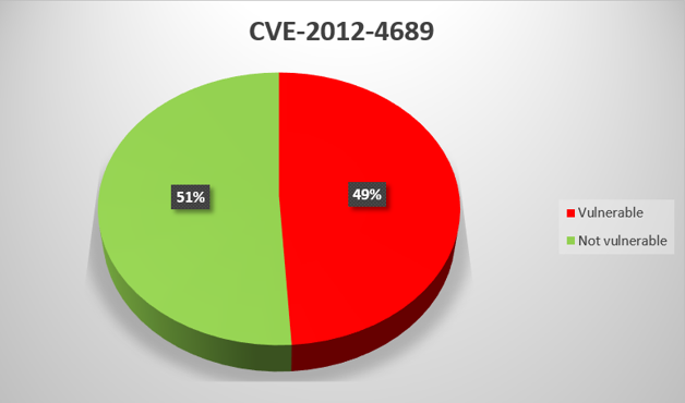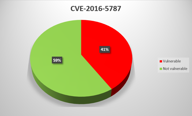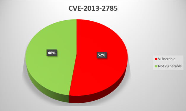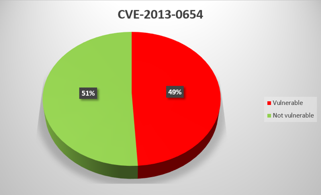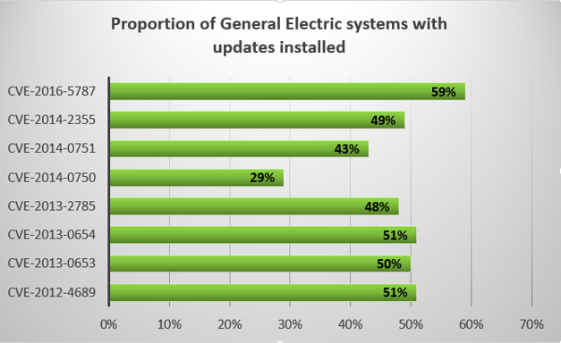 For each of the vulnerabilities, we calculated the proportion of vulnerable to non-vulnerable systems on industrial computers of Kaspersky Lab users. The results are displayed below. It is important to emphasize once more that the data reflects the situation on the machines of Kaspersky Lab customers who voluntarily participate in the KSN program only, and may not represent the distribution of vulnerable and non-vulnerable systems on all industrial computers of General Electric customers.