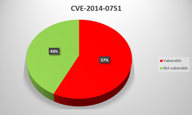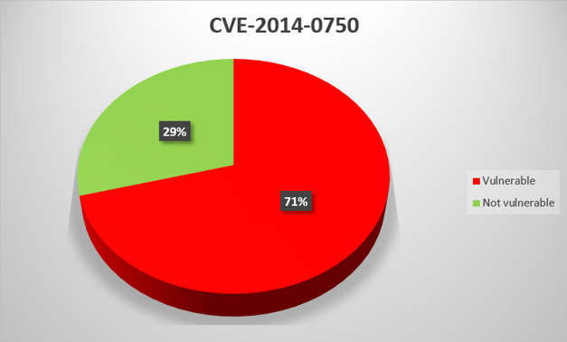 For virtually all General Electric product vulnerabilities that we analyzed, the proportion of systems with updates installed is between 40% and 60%. There is one exception – CVE-2014-0750, for which the figure is as low as 29%. The low proportion may be due to the fact that General Electric has not released a patch for this vulnerability, only instructions on how to fix it “manually”.