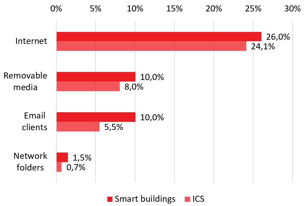 When studying the sources of threats to building-based automation systems, we decided to compare them with similar statistics on industrial systems that we regularly compile and publish. Here’s the result: