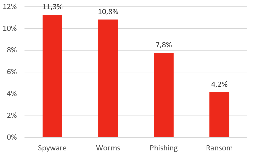 It should be mentioned right away that most of the blocked threats are neither targeted, nor specific to building-based automation systems. In other words, it is ordinary malware regularly found on corporate networks unrelated to automation systems. This does not mean, however, that such malware can be ignored — it has numerous side effects that can have a significant impact on the availability and integrity of automation systems, from file encryption (including databases) to denial of service on network equipment and workstations as a result of malicious traffic and unstable exploits. Spyware and backdoors (botnet agents) pose a far greater threat, since stolen authentication data and the remote control it provides can be used to plan and carry out a targeted attack on a building’s automation system.