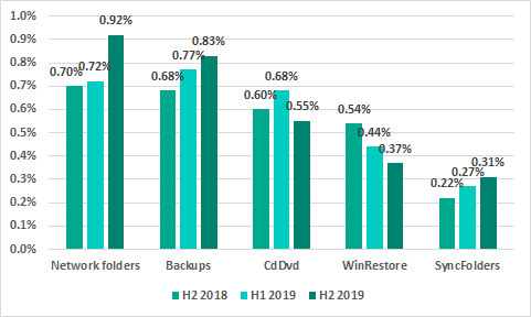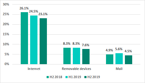 The downward trend continues for the percentage of ICS computers on which malicious objects from the internet were blocked. In H2 2019, this percentage has decreased by another 1.4 p.p.: the internet is now the source of threats blocked on 23.1% of ICS computers.