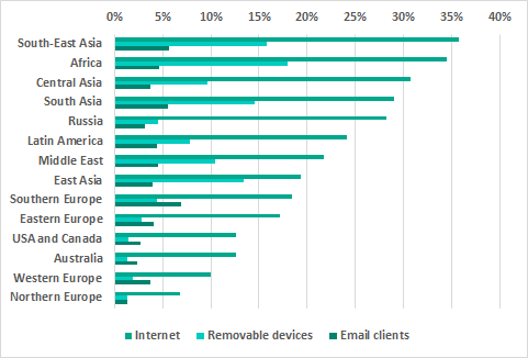 The internet is the main source of threats in all regions of the world. However, the percentage of ICS computers on which internet threats were blocked is much lower in Northern and Western Europe and in North America than in other regions.