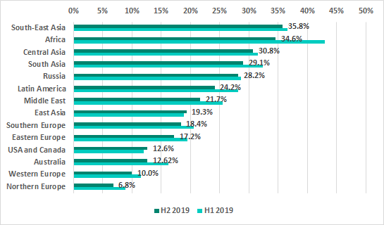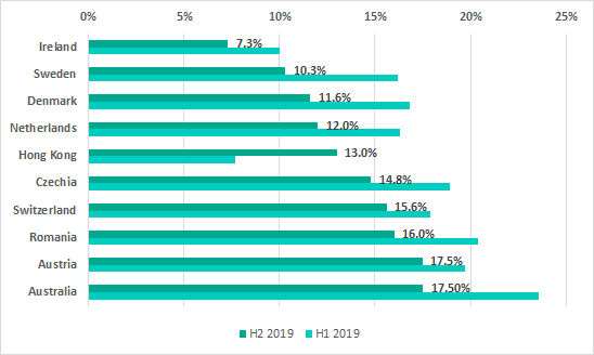 In H2 2019 the US (18.3%) dropped out of the TOP 10 ranking of most secure countries. Great Britain (19%) and Singapore (24.2%) were replaced in the ranking by Romania, Austria and Australia.