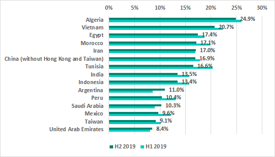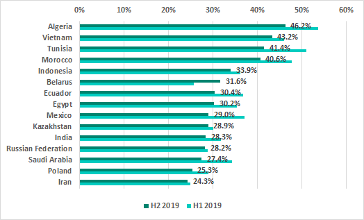 In H2 2019 we saw changes in a third of the TOP 15 countries ranked by the percentage of ICS computers on which malicious email attachments were blocked.