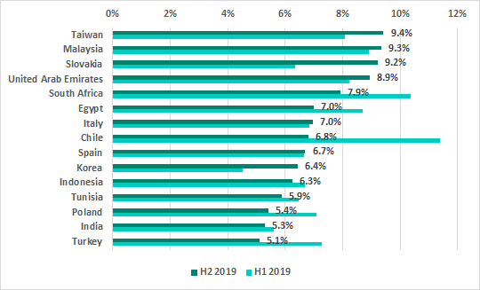 In H2 2019 the TOP 15 countries ranked by percentage of ICS computers on which malware was blocked when removable media were connected to them did see a few changes: Turkey, Kazakhstan, Thailand and Bolivia were ousted by Taiwan, Saudi Arabia, Argentina and the United Arab Emirates.