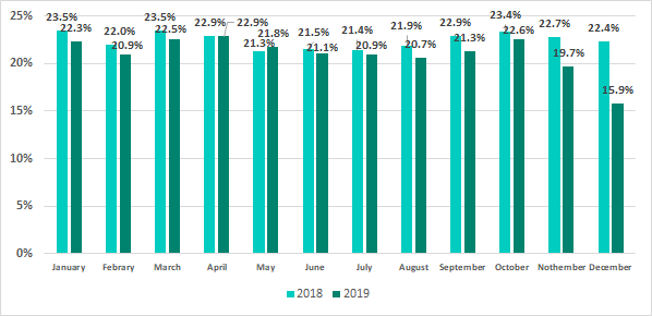 It’s worth noting that the seasonal dynamics that we have observed in recent years continued in 2019: the highest percentage of ICS computers on which threats were blocked was recorded in in spring and autumn. However, the decrease in numbers over November and December 2019 was greater than in 2018.