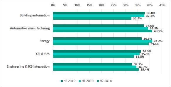 In H2 2019, malicious objects were blocked on 39.2% of ICS computers – this is lower than H1 2019 by 2 percentage points.