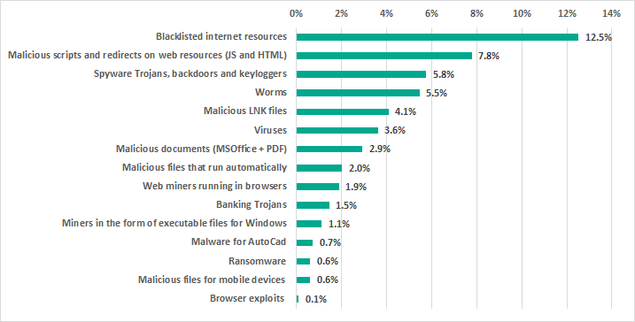 - 12.5% – blacklisted internet resources. Web-antivirus protects a computer when programs installed on it (browsers, email clients, automatic application update modules and others) attempt to connect to blacklisted IP addresses and URLs. Such web resources are associated in some way with distributing or controlling malware.Specifically, blacklisted resources include, among others, those used to distribute such malware as Trojan-Spy or ransomware disguised as utilities for cracking or resetting passwords on controllers of various manufacturers, or as cracks/patches for industrial and engineering software used in industrial networks.