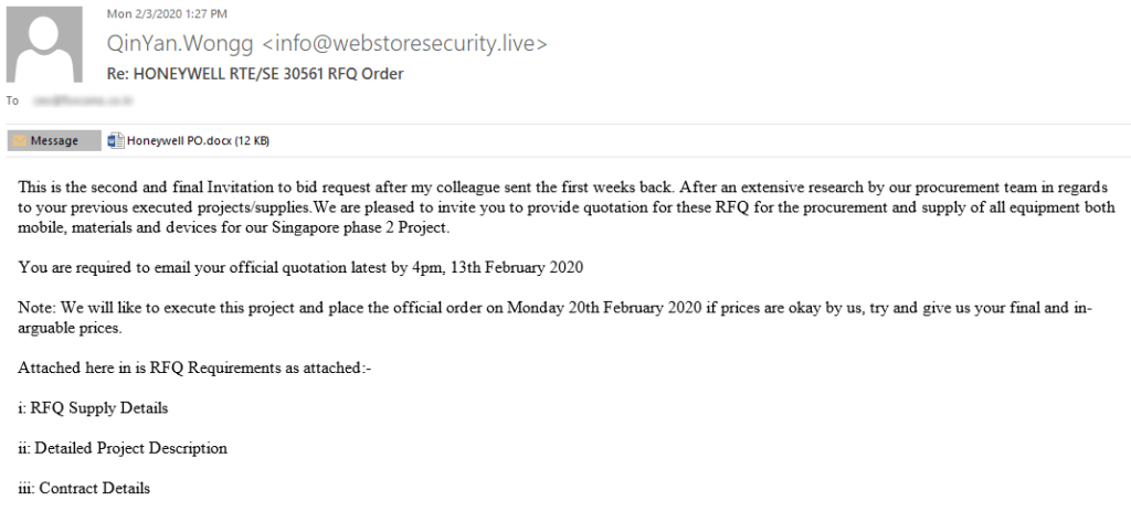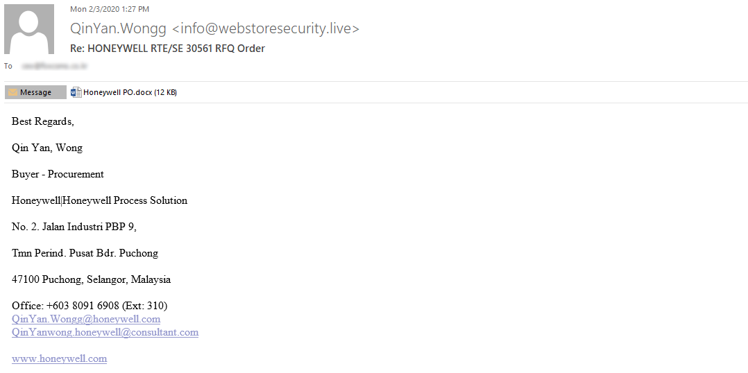 Among typical phishing emails, such as parcel shipping notifications, invoices, payment orders, RFQ, and phishing exploiting other popular themes like COVID-19, some targeted emails were detected. These mimic emails sent by various well-known industrial companies. Notably, in those cases cyber criminals use old exploits, such as CVE-2017-0199 and CVE-2017-11882, that were patched by the vendor back in 2017.