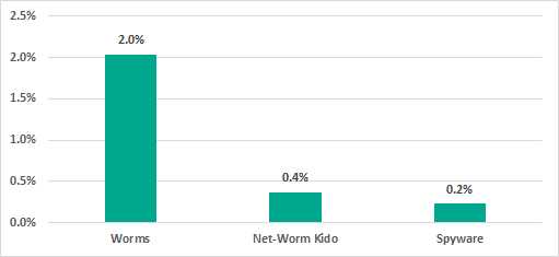 The most common threats blocked on removable media were worms (including the Kido net-worm) – mostly old variants first seen a decade ago, but still spreading in ICS networks. This is typical of ICS and is primarily due to a lack of essential security measures on some network nodes, allowing those worms to survive for such a long time.