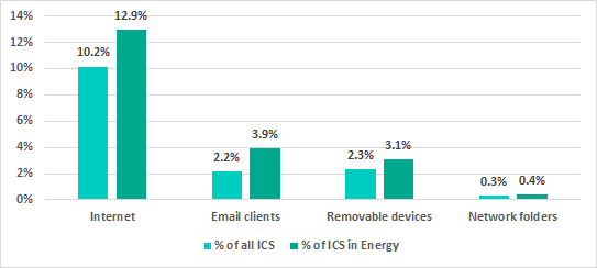 In qualitative terms, the threat landscape for ICS computers in the energy sector in the first quarter of 2020 was different from that for all ICS computers. Specifically, the percentage of ICS computers in the energy sector that were affected by internet threats was 2.7 percentage points (p.p.) higher that the percentage for all ICS computers. At the same time, the percentage of email threats was 1.7 p.p. higher.