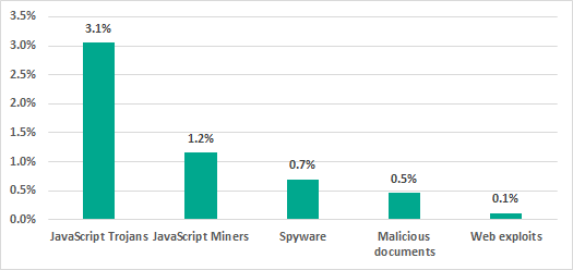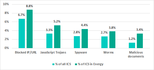 Besides phishing and malicious IPs/URLs blocked on 8.8% of ICS computers, most common internet threats for ICS computers in Energy in Europe were JavaScript Trojans (3.1%) distributed via malvertising banners and phishing websites and delivering various intrusive adware and crypto-miners.