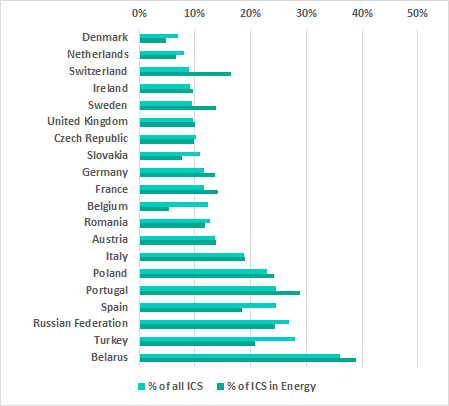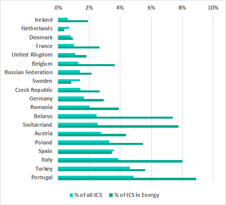 The graph below compares the percentage of all ICS computers in European countries on which malware was blocked in email attachments with a similar percentage for ICS computers in the energy sector.