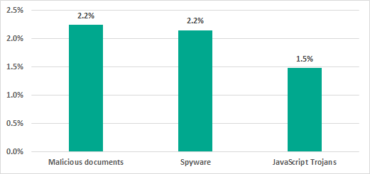 In total 1485 modifications of malware from 633 different malware families were blocked. These included a variety of multifunctional spyware (4.4%) designed to steal authentication data and enabling attackers to remotely control infected computers in automatic and manual modes, as well as ransomware (1%) and exploits for popular office software (3.4%) embedded in documents delivered via phishing emails and used to deploy spyware and ransomware – threats that are particularly dangerous and could negatively affect the availability and integrity of ICS systems and networks.