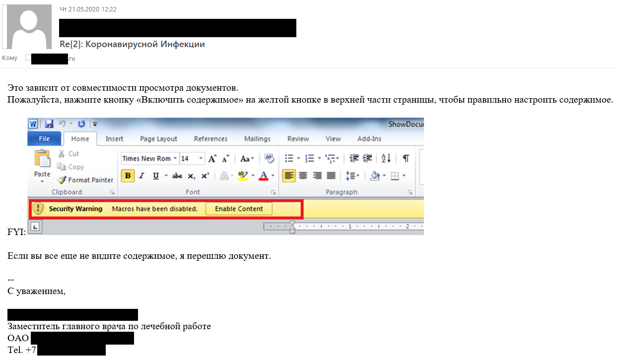 After sending the above email with explanations, the attackers realized that the target was using a different version of Microsoft Office and therefore required a different procedure for enabling macros. The attackers subsequently sent another email showing the correct procedure in a screenshot with a Russian language pack.