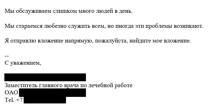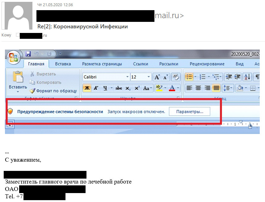 The attackers registered accounts with a public email service, making sure the sender’s email addresses looked similar to the medical center’s real email address. The signature shown in the phishing emails included the actual personal data of the deputy head doctor of the attacked organization’s medical center. The attackers were able to find this information on the medical center’s public website.