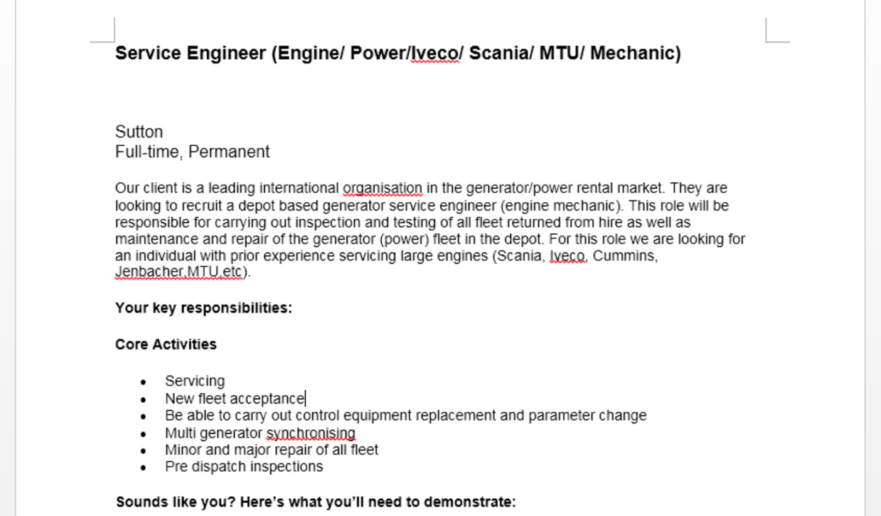 The content of the decoy document depicts the job description of a generator/power industry engineer.