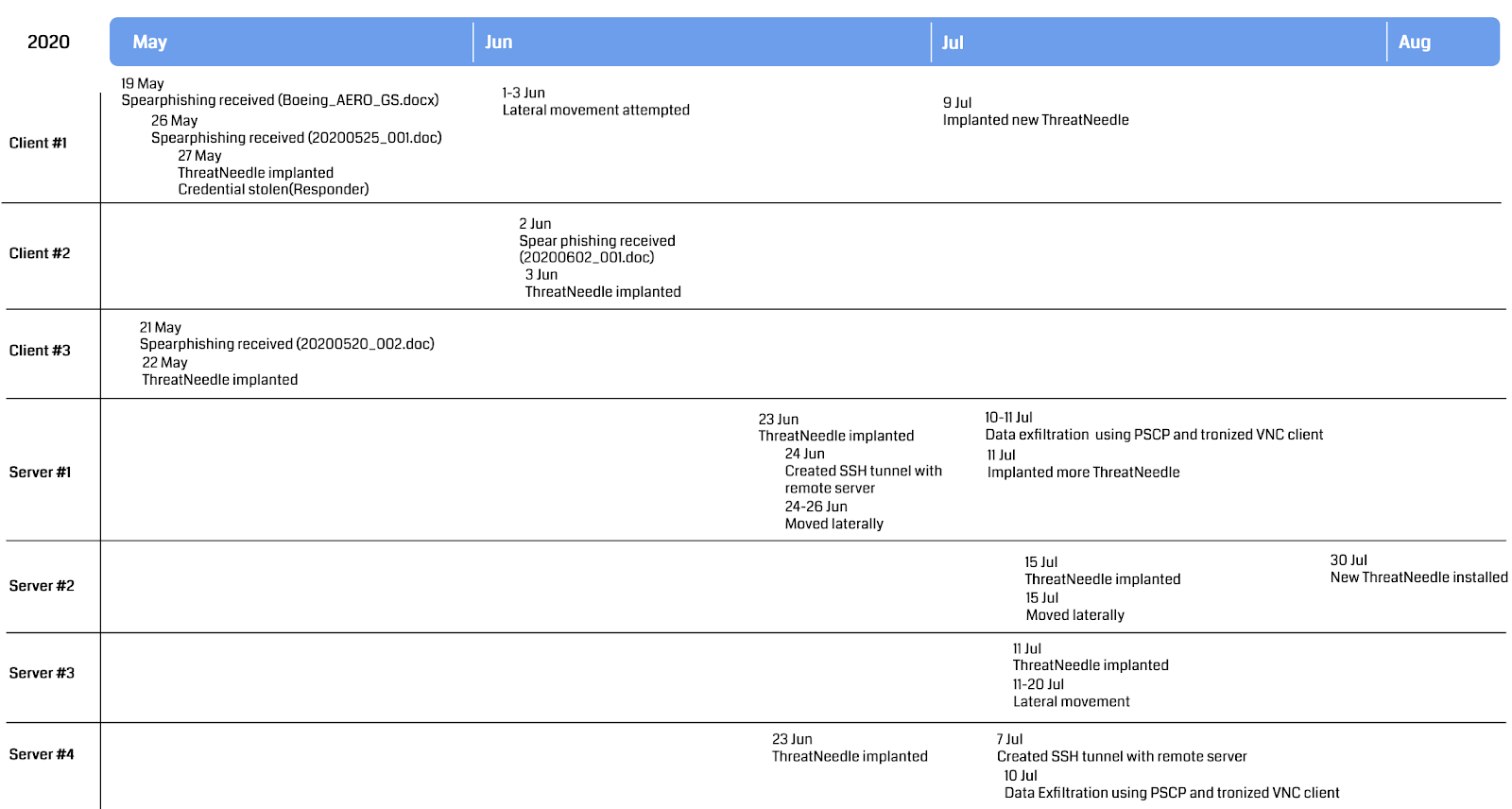 Judging by the hosts that were infected with the ThreatNeedle backdoors post-exploitation, we speculate that the primary intention of this attack is to steal intellectual property. Lastly, the stolen data gets exfiltrated using a custom tool that will be described in the “Exfiltration” section. Below is a rough timeline of the compromise we investigated: