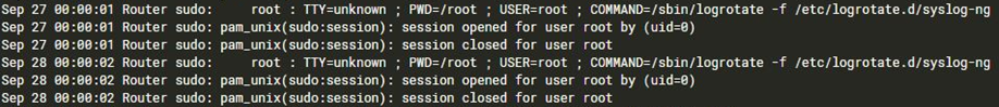 The attackers also ran the nmap utility on the router VM and scanned ports on systems within the restricted segment of the enterprise network. On September 27, the attackers started removing all traces of their activity from the router, using the logrotate utility to set up automatic deletion of log files.