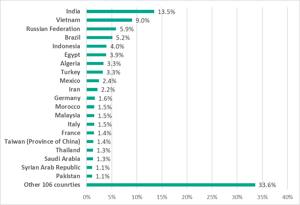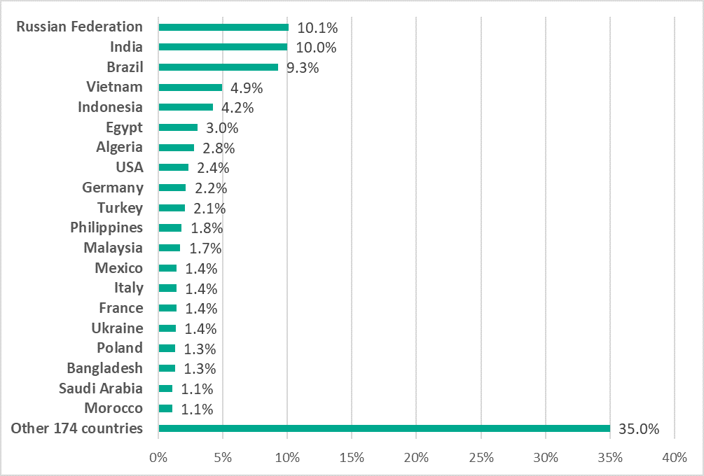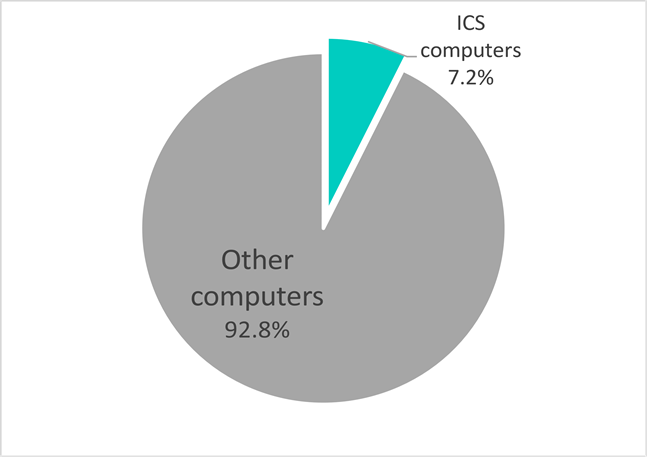 As shown in the diagram below, nearly a third (29.4%) of non-ICS computers are located in Russia (10.1%), India (10%), and Brazil (9.3%).