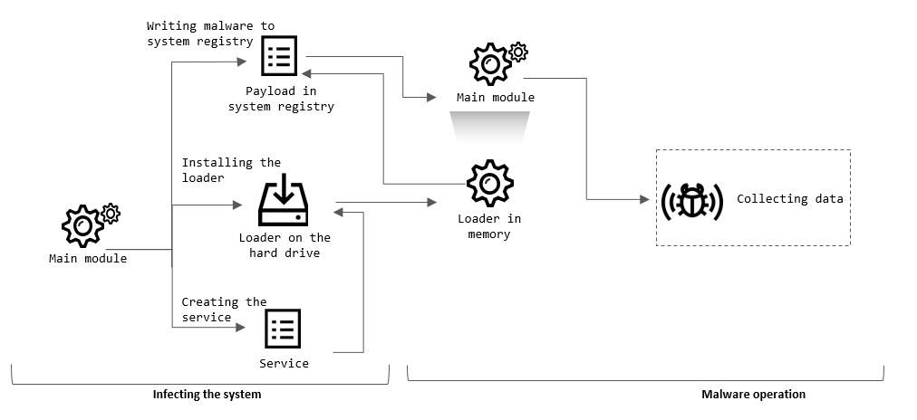After this and, subsequently, after system restarts, the malware loader is executed. Using the value of the MachineGuid key to determine the location of the payload in the system registry, the loader loads, decrypts and executes the main component of the malware.