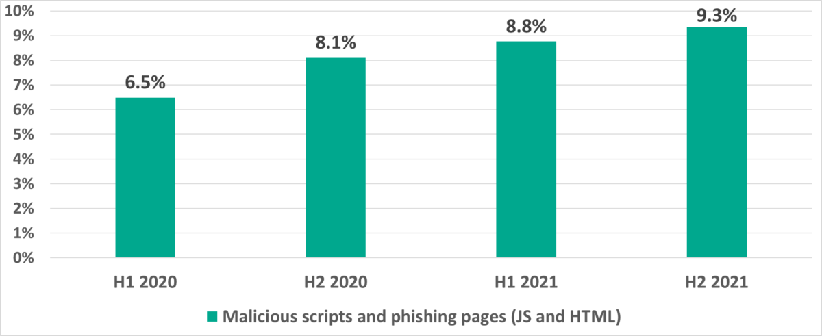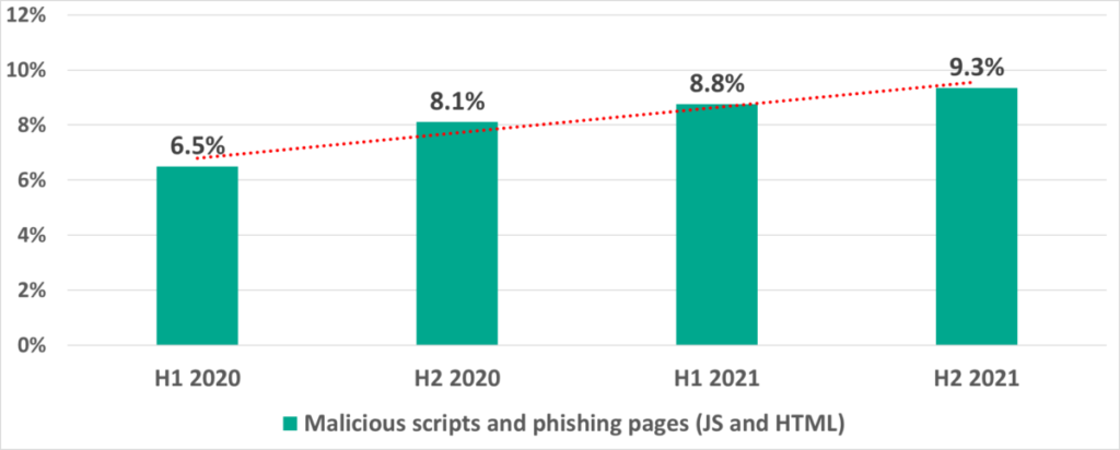 - Malicious scripts and phishing pages – by a factor of 1.4 – from 6.5% to 9.3%.
