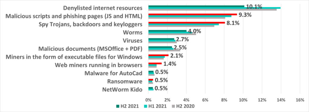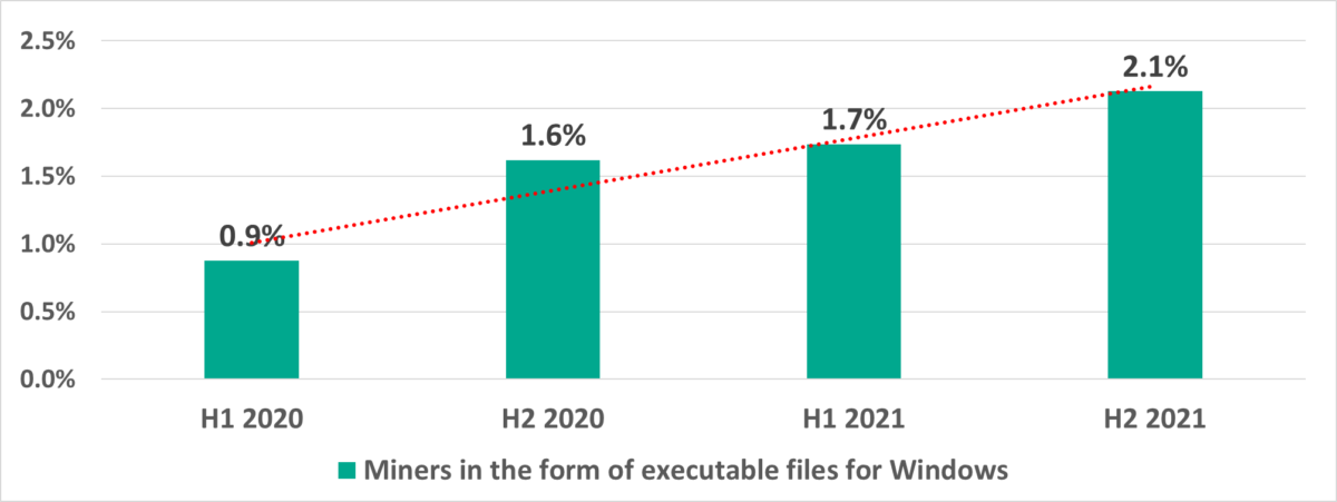- Cryptocurrency miners (Windows executable files) – more than doubled – from 0.9% to 2.1%.