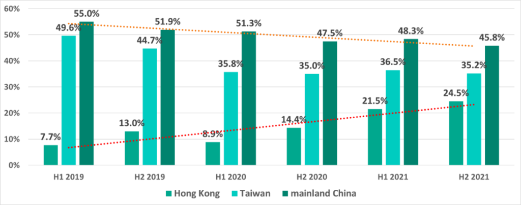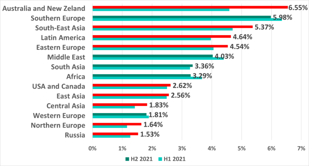 Notice that in H1 2021 Australia and New Zealand was the only region where this percentage increased (+1.3 p.p.). In H2 2021 we saw this percentage increase in 10 out of 14 regions worldwide.