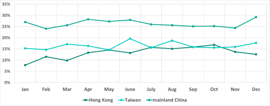 Moreover, the dynamics of this indicator vary significantly in different countries and territories. For example, we saw this number continue to grow in Hong Kong, but at the same time the percentage of ICS computers on which malicious objects were blocked is gradually decreasing in Taiwan and, even more noticeably, in continental China.