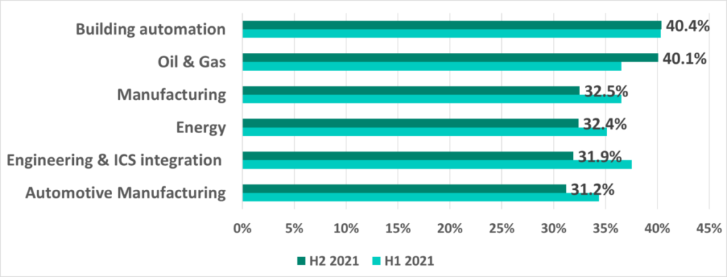 In H2 2021 oil and gas was the only industry where the percentage of ICS computers on which malicious objects were blocked rose (+3.5 p.p.). Interestingly, in H1 2021 we saw percentages fall across all industries, with the greatest drop in the oil and gas sector (-7.5 p.p.).