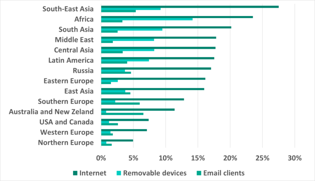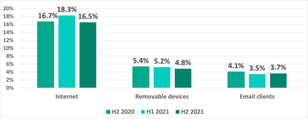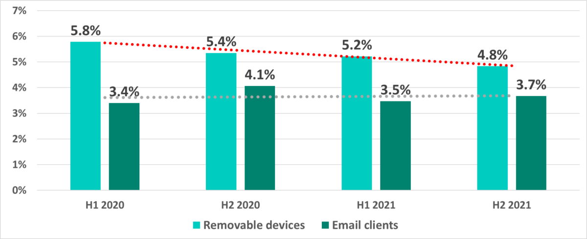 The Internet remains the main source as usual, with removable devices coming in second and email clients third. However, we are seeing the gap between last two sources gradually closing. The number for removable devices has been dropping every half year.
