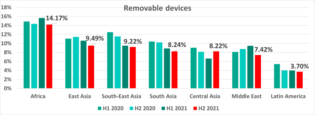 We see that in Central Asia the percentage of ICS computers on which threats were blocked when removable devices were connected is also decreasing every 6 month period except for H2 2021 when it rose again. Interestingly, we see the opposite in the Middle East where the percentage grew over every 6 month period until H2 2021 when it dropped noticeably.
