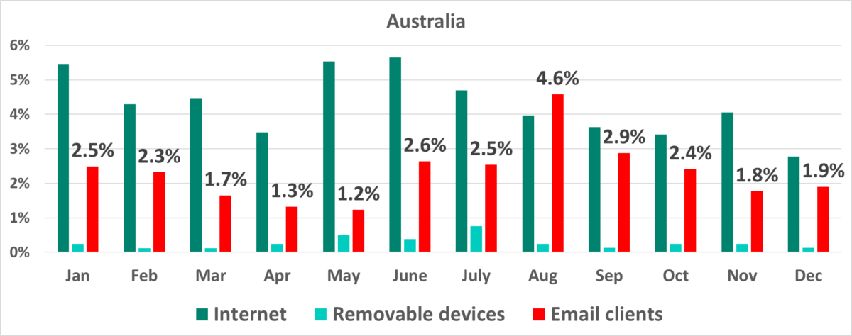 In these regions, email makes a significant contribution to the stream of threats. For example, in August 2021 the percentage of ICS computers on which malicious email attachments were blocked was higher in Australia than the percentages for other sources of threats, including the internet.