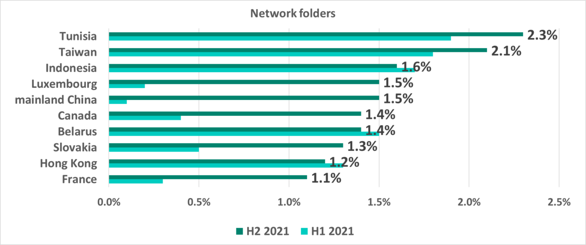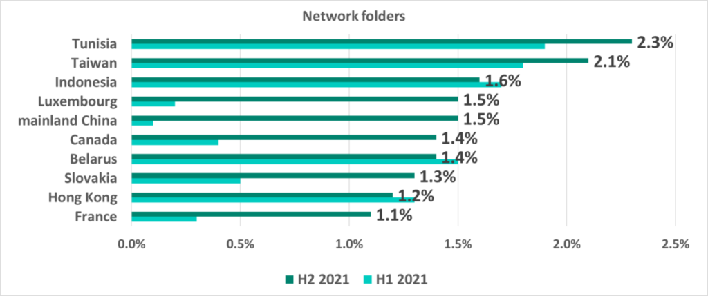 Shared network folders are one of the minor threat sources. Only on 0.57% of attacked ICS computers malicious objects were blocked in network shares in H2 2021. However, this percentage is slowly growing and is over 1% in a few countries and territories.