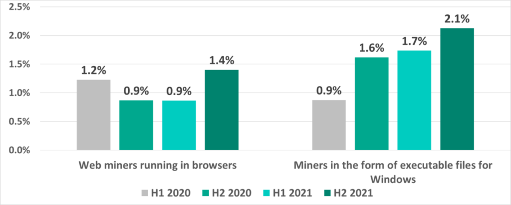 Significantly, as threat actors use scripts more and more, they are also using cryptocurrencyminers increasingly. The percentage of ICS computers on which miners (executable Windows files) were blocked has more than doubled from H1 2020. In H2 2021 we see the percentage of web miners growing as well.