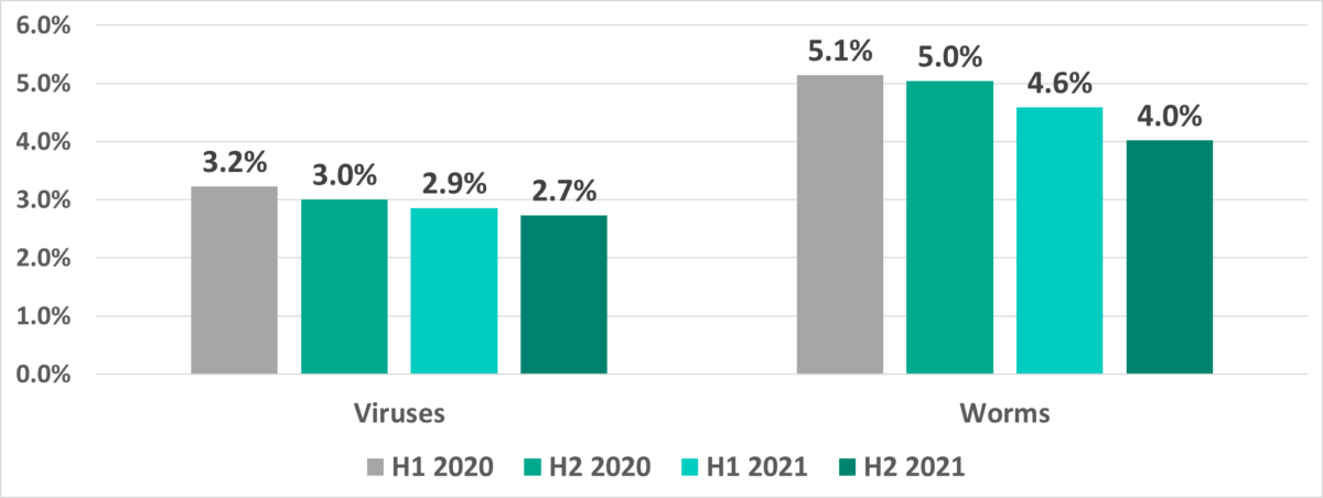 As usual, viruses and worms are in fourth and fifth place, respectively. The good news is that the percentage of ICS computers on which these types of malware are blocked is slowly, but steadily decreasing.