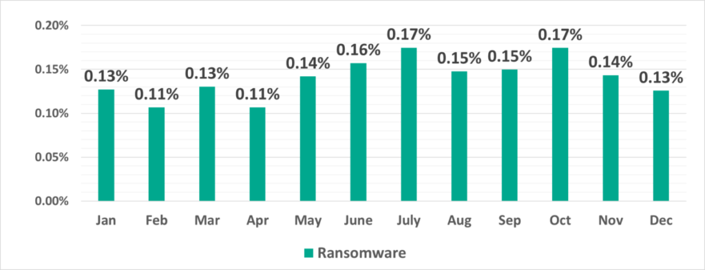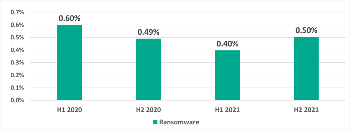 In H2 2021 ransomware was blocked on 0.50% of ICS computers. The highest percentage of ICS computers on which ransomware was blocked in 2021 was recorded in July and October (0.17%) and the lowest in February and April (0.11%).