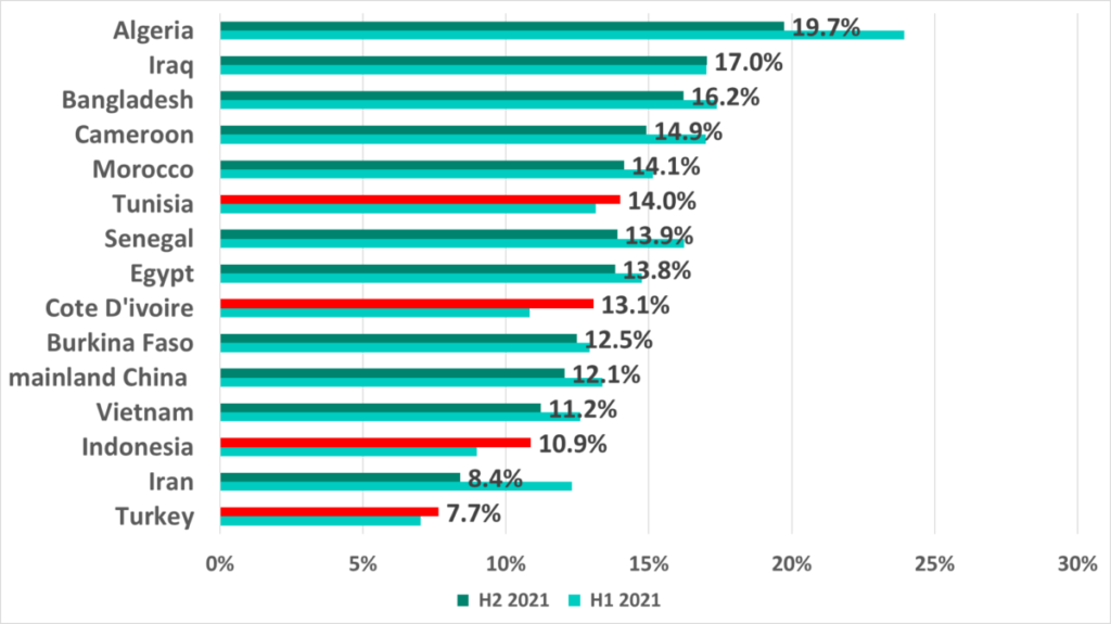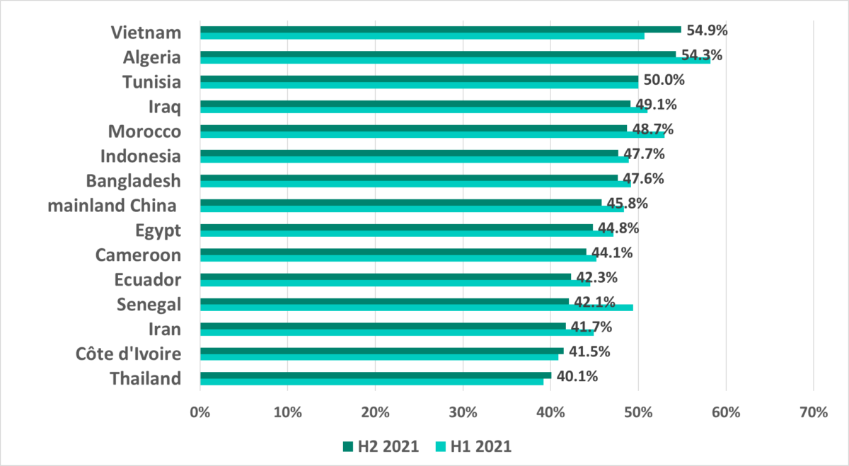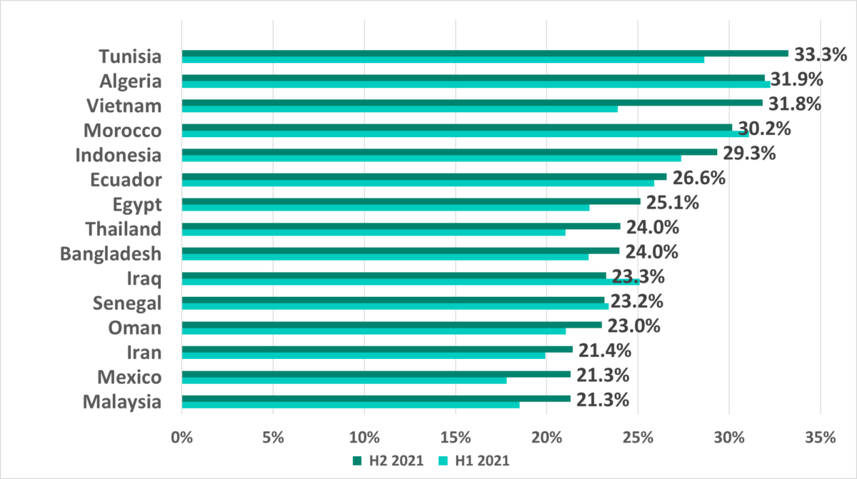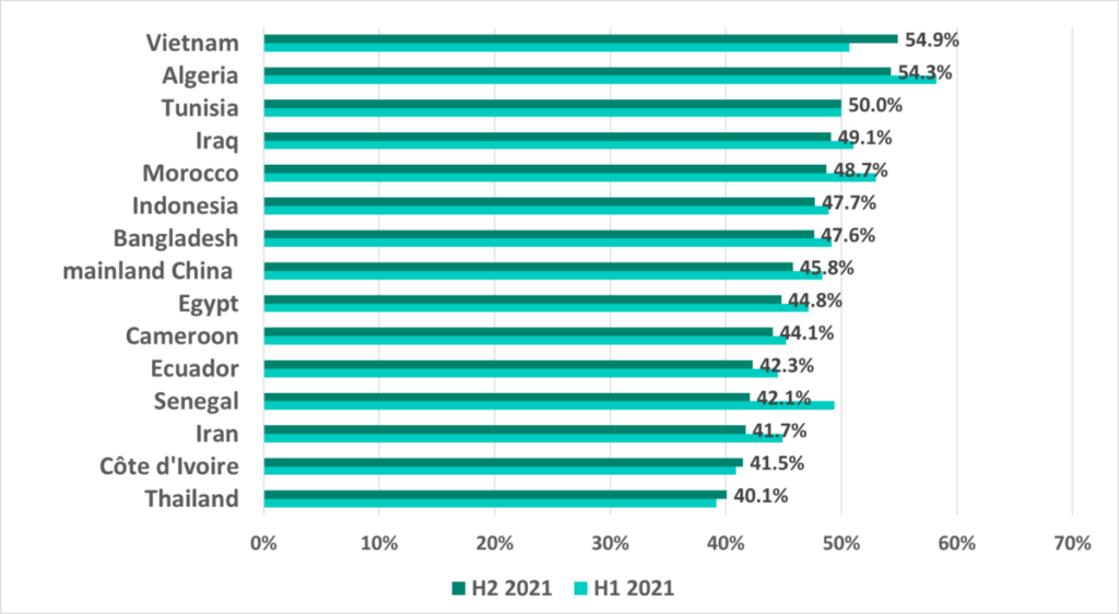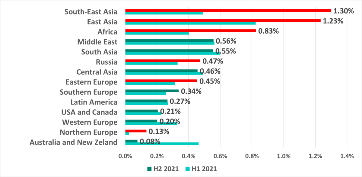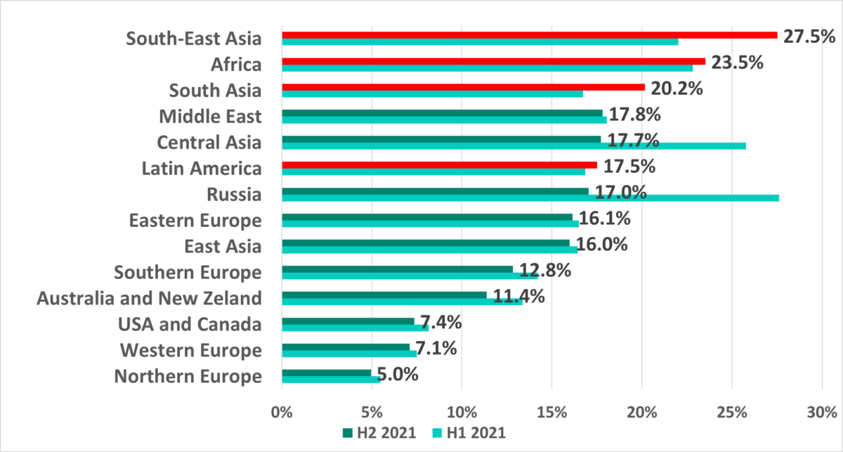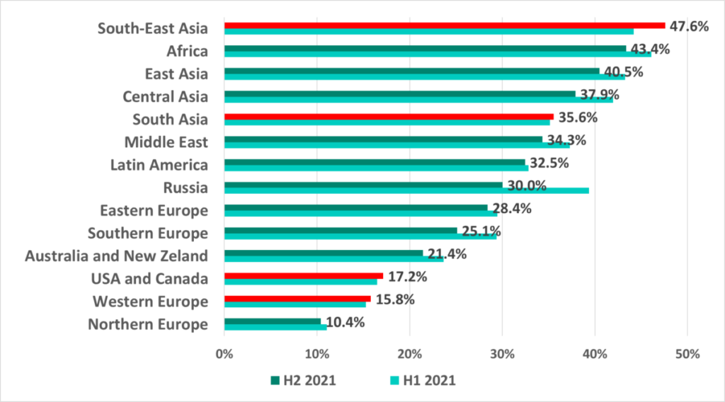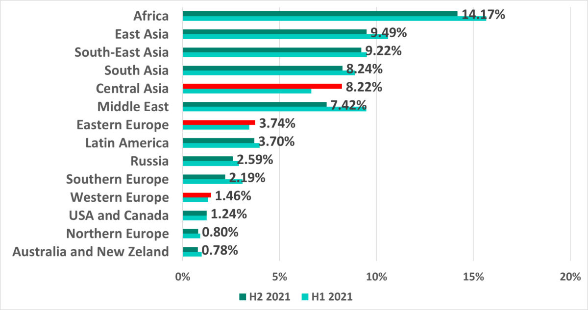 In H2 2021 this percentage decreased in all regions except for Central Asia, Eastern Europe and Western Europe.