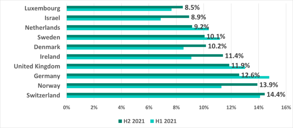 The lowest percentage in H2 2021 was recorded in Luxemburg.
