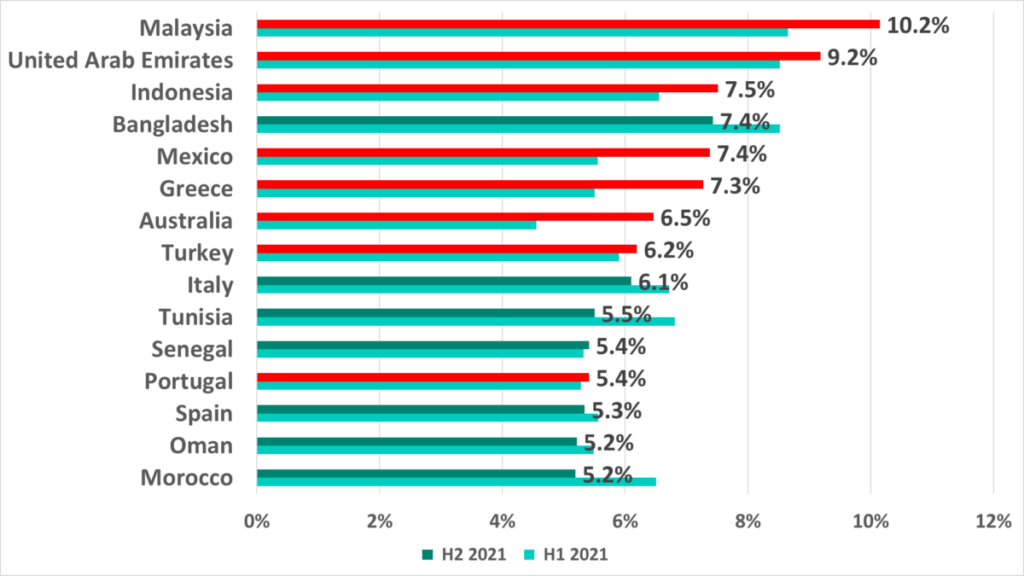 Just as in H1 2021, we see the following European countries in this ranking – Greece, Italy, Portugal, and Spain.