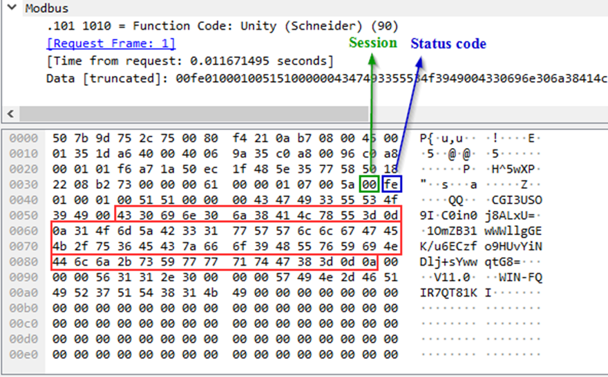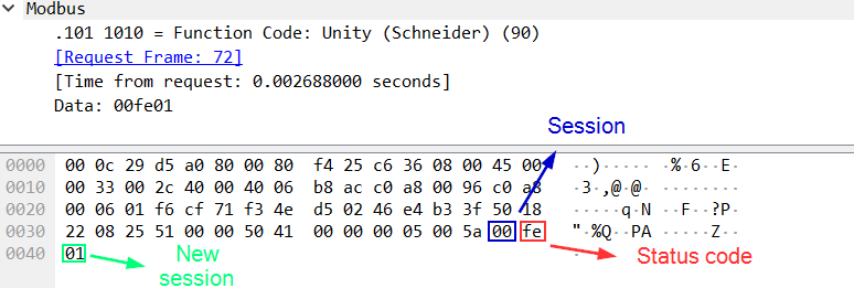 If the request is successfully fulfilled, the PLC will return session ID (0xf8 on the screenshot below) to EcoStruxure™ Control Expert.