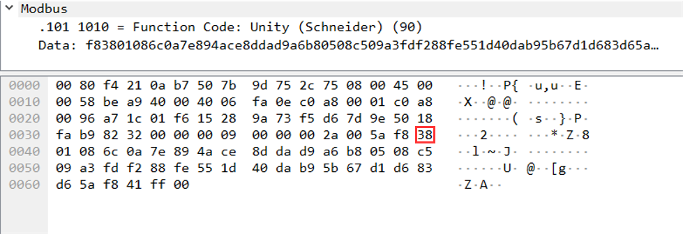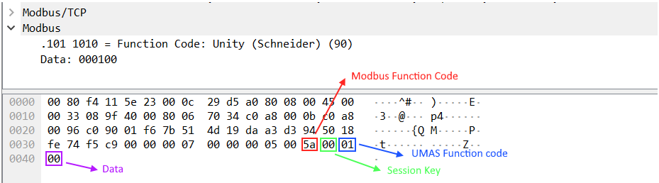 TCP DATA – Modbus Header – 0x5A – session – 01(UMAS function code) – 00(data)