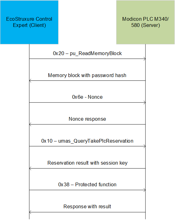 It can be seen from the above analysis of the PLC reservation process using the new and improved mechanism that the new method is by no means secure since all computation is performed on the client side (i.e., by EcoStruxure™ Control Expert), while the “secret” can be obtained from the PLC without authentication.
