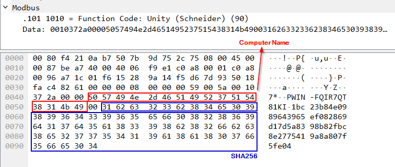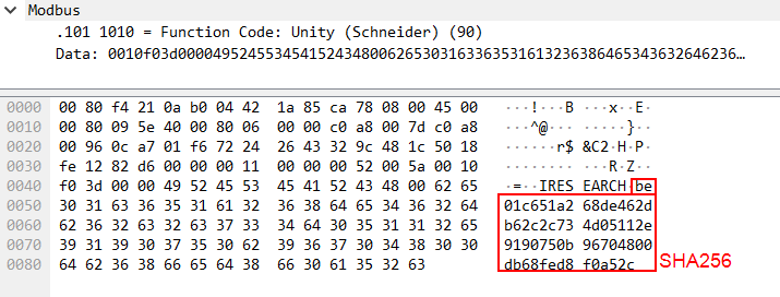 The screenshot below shows a request from the client (EcoStruxure™ Control Expert) to the PLC to reserve the device using the SHA256 hash computed in the final step.