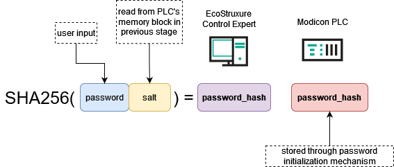When the client (EcoStruxure™ Control Expert) has obtained the salt value for hashing, it can start the PLC reservation procedure. The client computes the SHA256 hash of the password entered by the user with the salt obtained at the previous step to compute the password hash.
