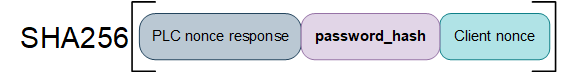 SHA256 (PLC nonce response + base64 strings (password hash) from PLC's memory block + EcoStruxure Control Expert nonce)